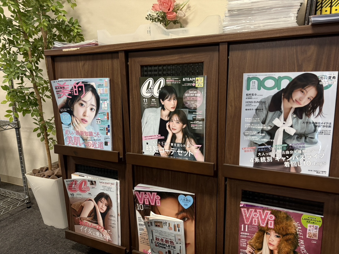 入口から女性に嬉しいファッション雑誌が6種類ございます!また1ヶ月に1回雑誌が新しくなるのも魅力です!